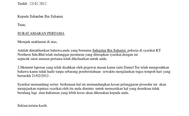 . Perkhidmatan Bilangan 7 Tahun 1993 Surat Pekeliling Perkhidmatan Bilangan 4 Tahun 1986Sur at Edaran. Selari dengan perkembangan pesat teknologi digital Kementerian Pendidikan Malaysia akan menggunakan teknologi dan kandungan digital dalam dalam bidang pendidikan. 2012 Kepada Suhaidan Bin Suhaimi Tuan SURAT AMARAN PERTAMA Merujuk maklumat di atas Adalah dimaklumkan bahawaanda yang bernama Suhaidan Bin Suhaimi pekerja di syarikat KT Northern SdnBhd telah melanggar peraturan yang ditetapkan syarikatdengan ini sepucuk surat amaran pertama telah dikeluarkan untuk anda.